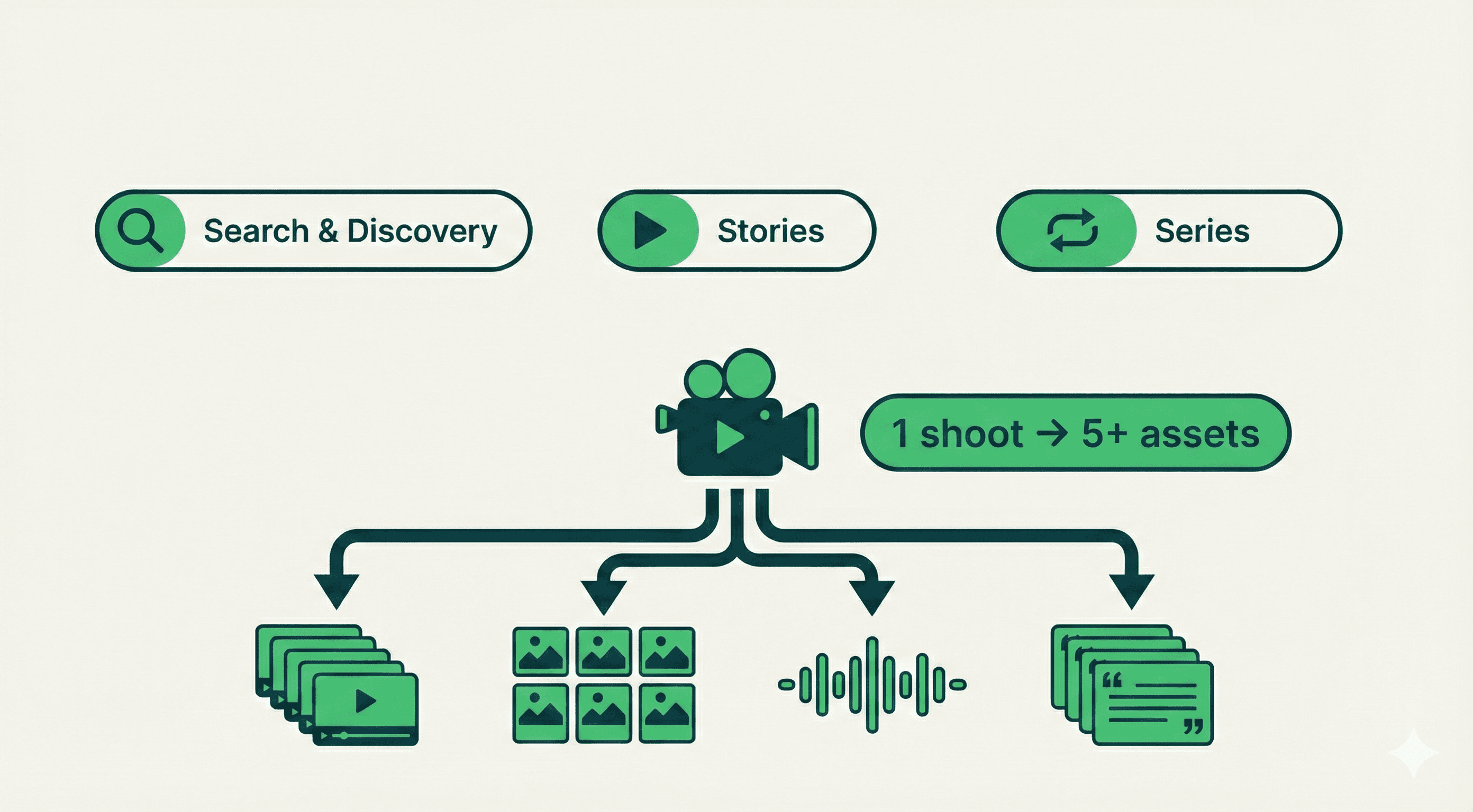 One shoot becomes 5+ assets: full videos, social clips, quote cards,