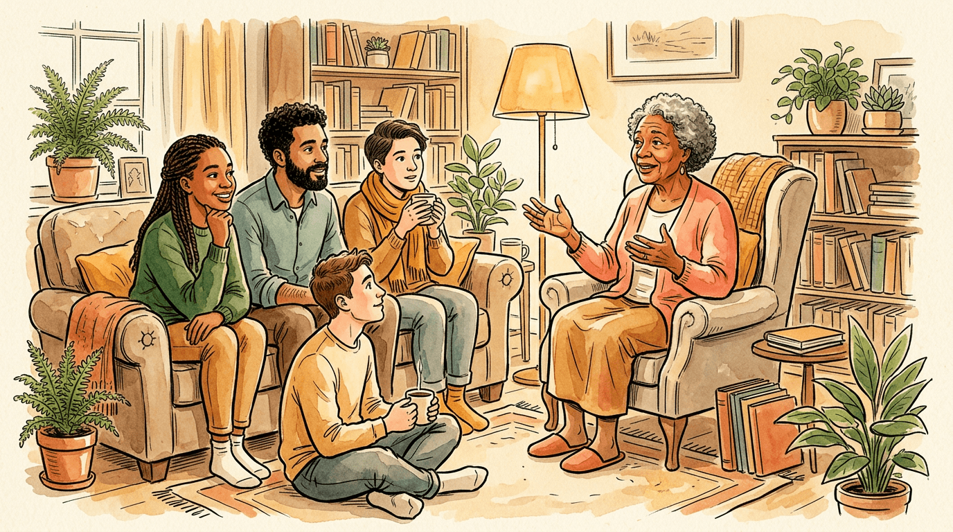 This is narrative transportation -- the neurological state in which a person's attention, emotion, and mental imagery become fully absorbed in a narrative. It is not passive reception. It is active co-creation. The listener's brain is literally simulating the experience being described.